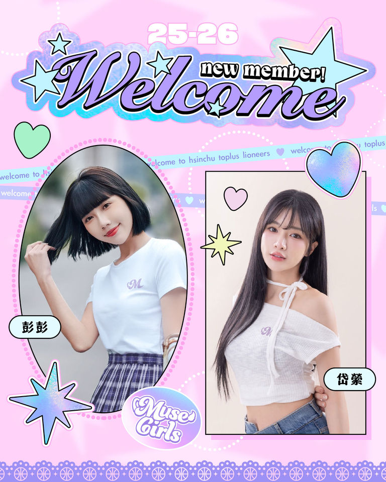 Muse Girls新賽季除了有韓援加盟外,「北醫大淘氣女神」彭彭、「零死角女神」岱縈也正式加入團隊。彭彭以甜美外貌與親和笑容在社群累積近30萬粉絲,過往經歷橫跨棒球與籃球領域,展現甜美的應援能量。
