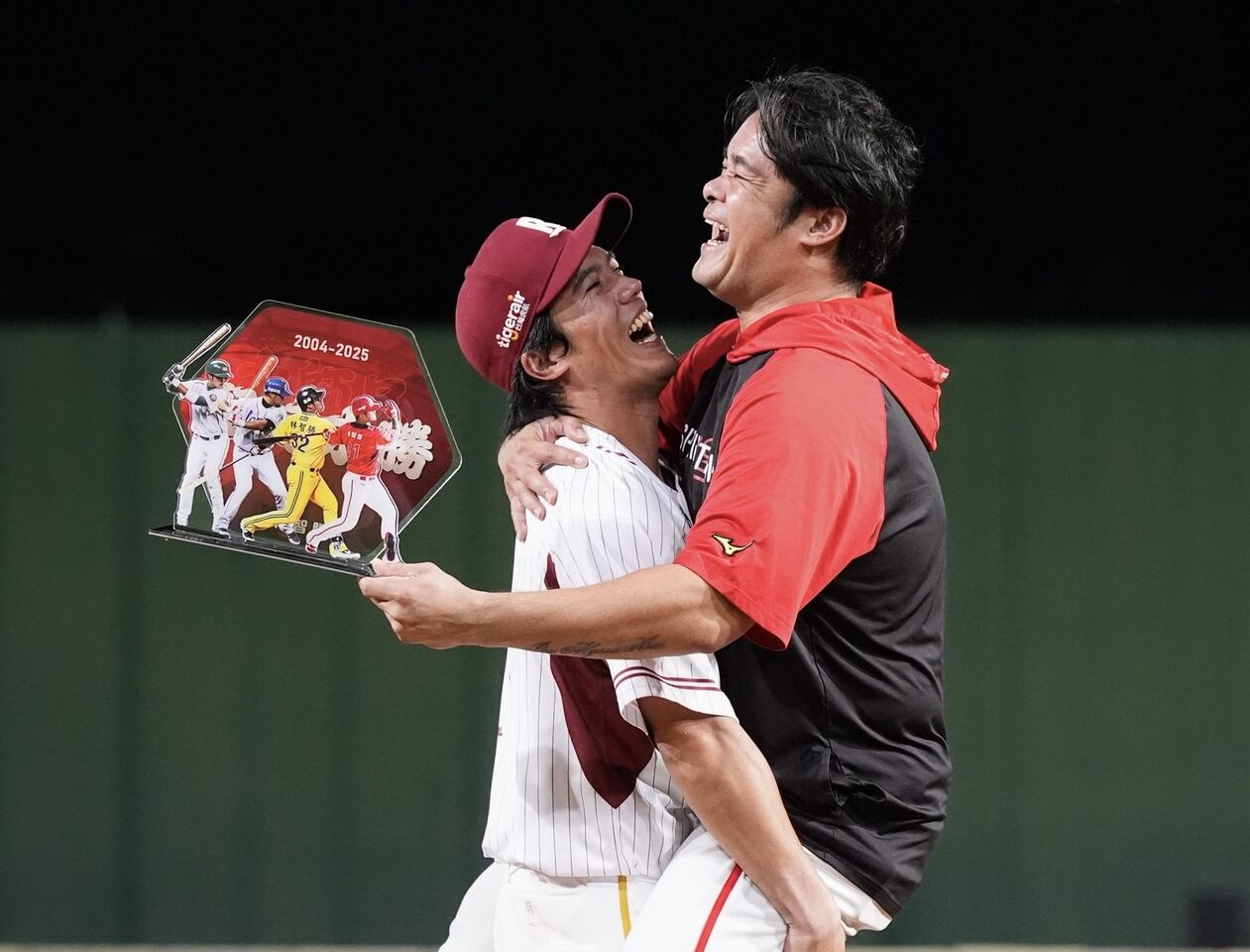 最後,過去曾和林智勝並肩作戰的教練、球員與行政人員,包括現已轉戰味全的郭嚴文、陳禹勳,都一起上台合照,夢回昔日輝煌時刻。桃猿全體教練與球員更列隊致敬,林智勝逐一握手,場面溫馨感人。