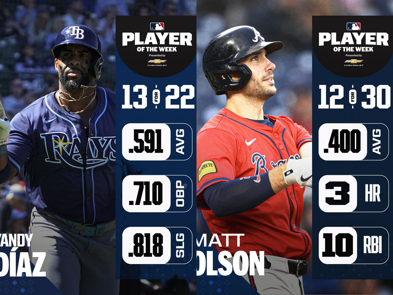 美國職棒大聯盟(MLB)在22日(日本時間23日)公布了本周(15日至21日)的單周最佳球員。國聯方面由勇士隊內野手歐森(Matt Olson)獲獎,美聯則由光芒迪亞茲(Yandy Díaz)獲選。