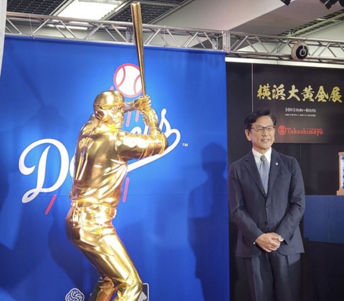 洛杉磯道奇球星大谷翔平的等身大「黃金像」1日在日本橫濱高島屋百貨正式公開。該雕像高度約190公分,使用1550片金箔製作而成,以「黃金打者大谷翔平」為名,在6日前的「橫濱大黃金展」中展出。該作品由金製品製造銷售商SSG打造,以大谷打擊姿勢為原型,並獲得本人正式授權。