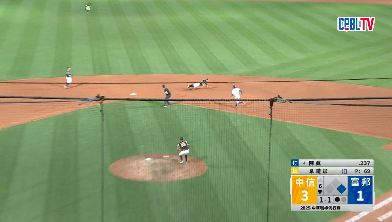 比賽進行到5局下,悍將靠著王念好的高飛犧牲打追回1分,攻勢仍在延續。陳真隨後擊出一記強勁飛球,直直朝投手韋禮加而去。白色小球砸中韋禮加的手套後彈了出去,朝二壘方向飛去。