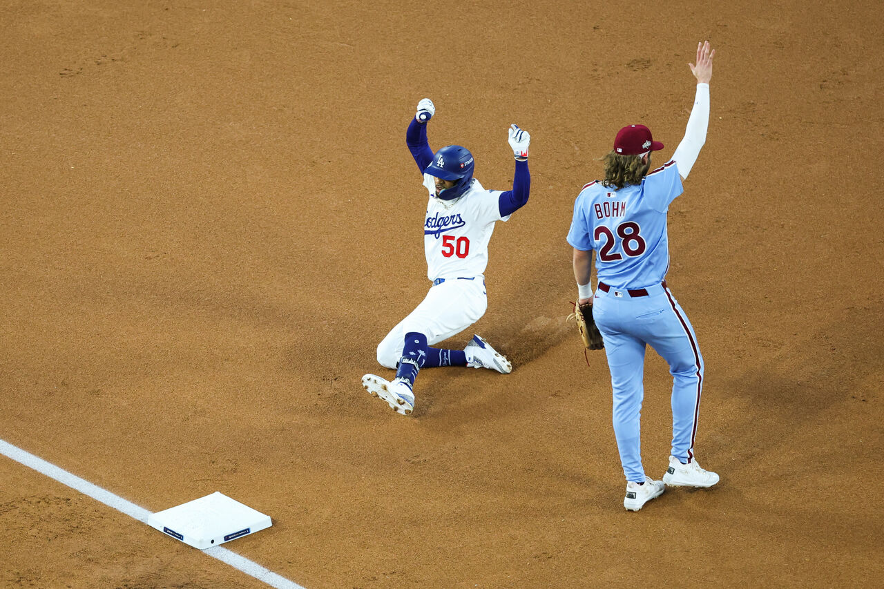 貝茲在首局面對對方先發諾拉(Aaron Nola),鎖定速球將球強勁擊向右中外野,費城人外野手馬許(Brandon Marsh)撲接未果,貝茲迅速飛奔至三壘,完成他季後賽79場出賽以來的首支三壘安打。