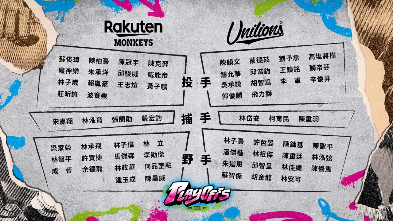2025中華職棒季後挑戰賽將於明(10)日點燃戰火,由統一7-ELEVEN獅對戰樂天桃猿,展開五戰三勝制的對決,上半季冠軍統一7-ELEVEN獅握有一勝優勢,率先取得三勝的隊伍將前進台灣大賽。南北征戰考驗選手體能,場上布局更將左右戰局走向,兩隊參賽名單正式公布,雙方皆派出最強陣容應戰,全力爭奪通往總冠軍賽的關鍵門票。