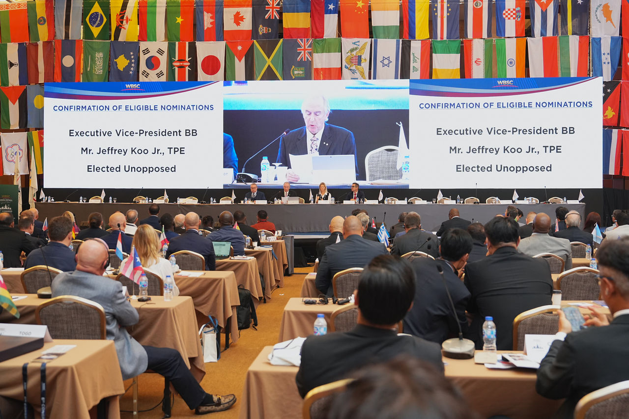 ▲亞洲棒總會會長辜仲諒今日在全體世界棒壘球總會會員代表支持下,成功連任執行副會長。(圖/棒協提供)