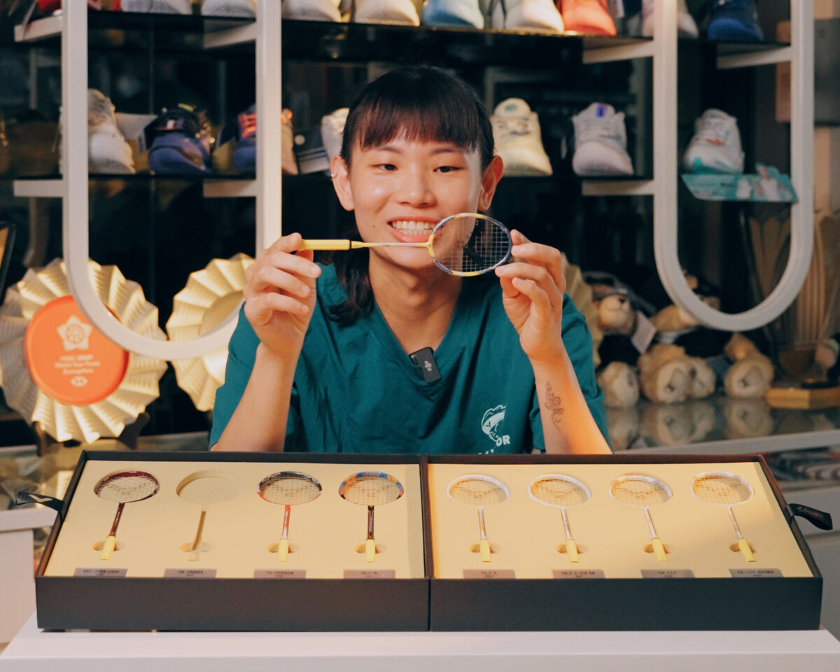 當戴資穎親自打開收藏盒,八支熟悉的球拍整齊排列於典雅的黑金禮盒中,映照出她職業生涯的縮影。