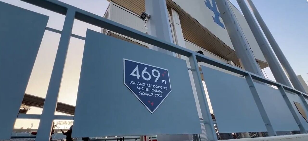 道奇體育場外野看台後方牆面上,設有以本壘板造型設計的紀念銘牌,用來記錄那些真正飛出球場的「場外全壘打」。就在本月8日(台灣時間9日),費城人巨砲舒瓦伯(Kyle Schwarber)在分區系列賽第3戰面對山本由伸時,也曾轟出直擊右翼屋頂的全壘打,後來被列為第7枚紀念銘牌。