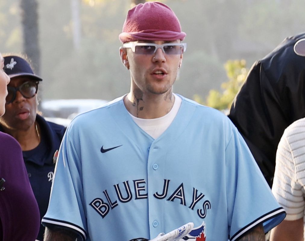 ▲小賈斯汀今天身穿藍鳥投手比柏(Shane Bieber) 的球衣進場,比柏預計明天第4戰先發,與大谷翔平同場較勁。 。(圖/截自X)