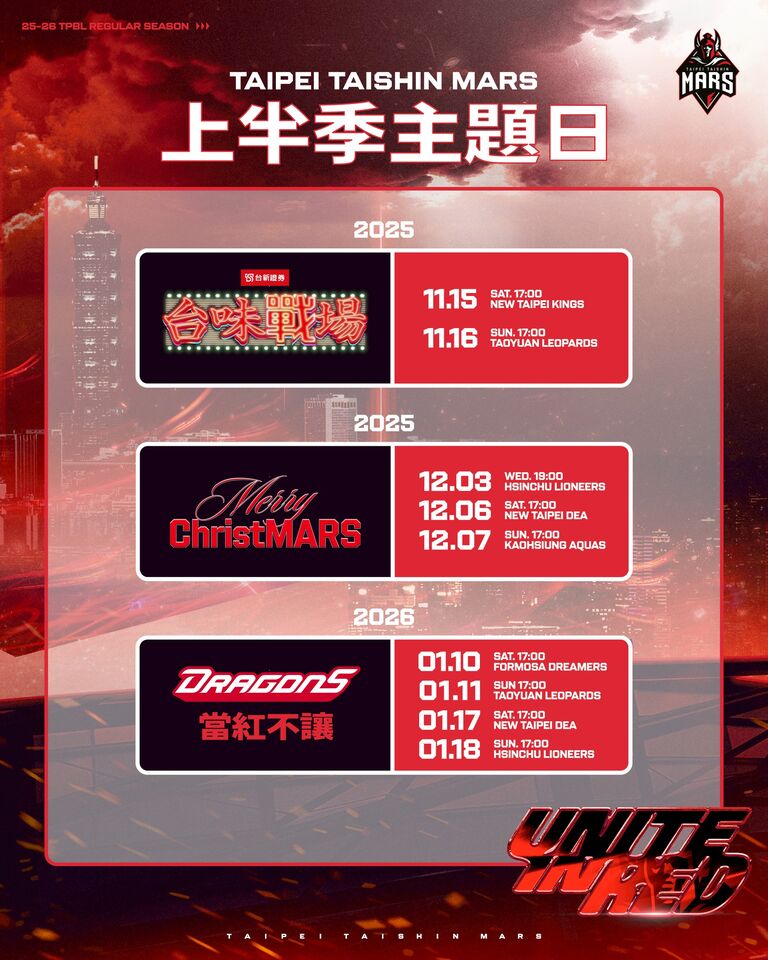 進入12月,戰神主場將於3日、6日及7日舉辦「Merry ChristMARS」聖誕主題活動,顛覆傳統紅色聖誕印象,以「無懼黑」打造暗黑派對。現場結合音樂、美食與交換禮物,讓球迷在冬夜感受最潮的臺北聖誕節。