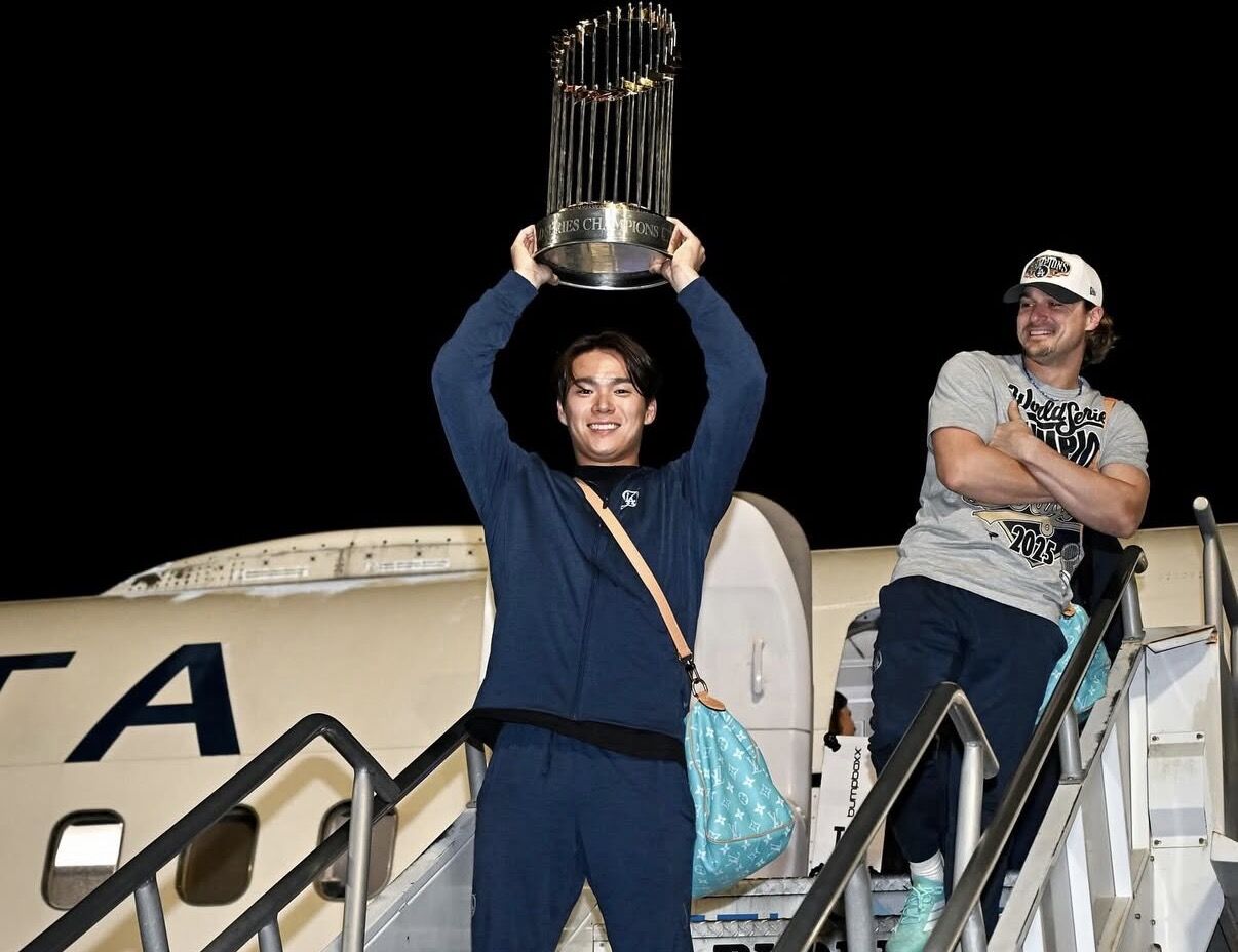 道奇官方社群貼出返抵畫面,寫道:「獎盃回家了。」照片中,山本舉起金光閃閃的冠軍獎盃,走下包機,後方的Kike雙手交叉、微笑相隨,宛如守護他的長兄。