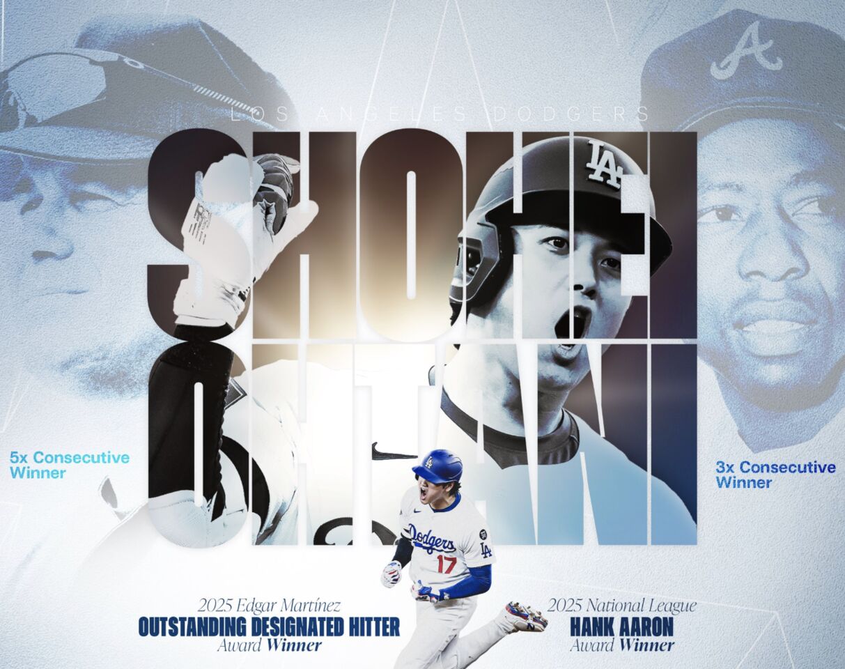 另外,大谷也奪下漢克阿倫獎,從2023年起已連3年獲獎;最佳DH則完成5連霸,追平名人堂球星「老爹」歐提茲(David Ortiz)的紀錄,並再度入選年度第一隊(DH)。
