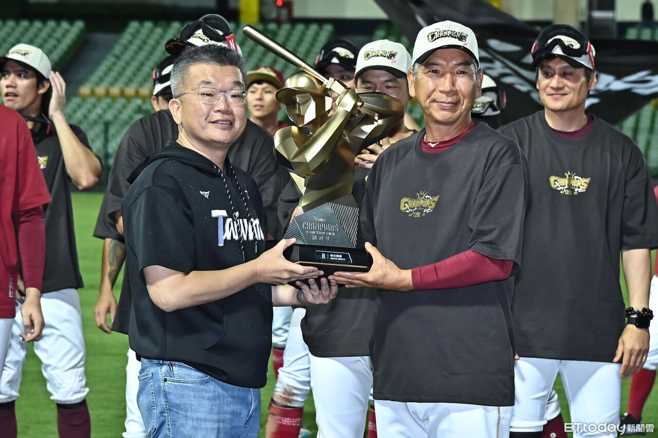 ▲前桃猿總教練古久保健二從蔡其昌會長手中接過冠軍獎座。(圖/記者李毓康攝)