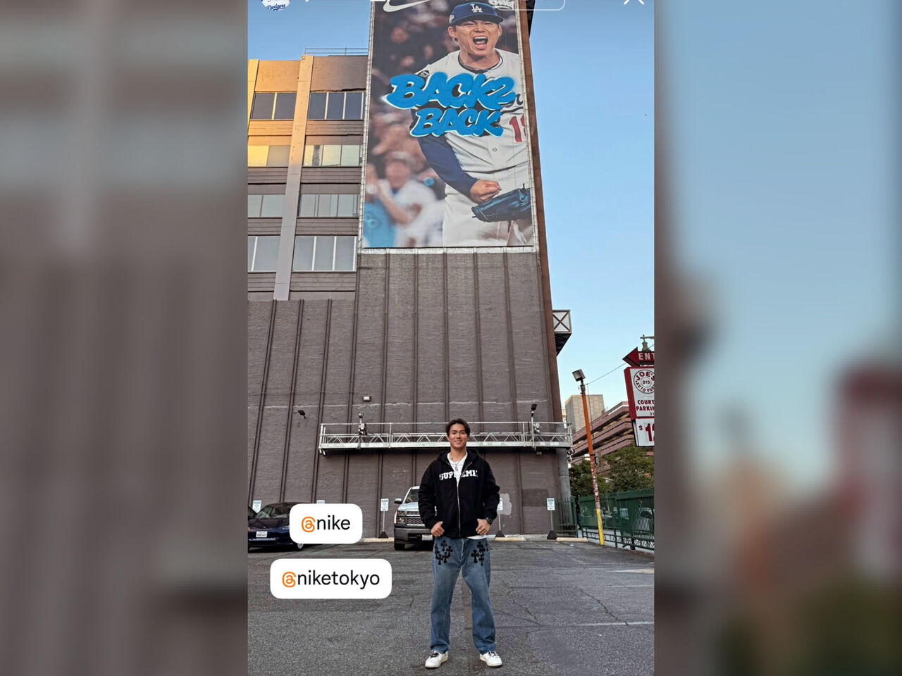山本特地造訪這座在 LA 誕生的「新地標」。畫面中,他站在描繪自己在投手丘上怒吼的巨大看板前合影。看板上以噴漆寫上「BACK 2 BACK」,向他連續兩年登上巔峰致敬,視覺相當震撼。