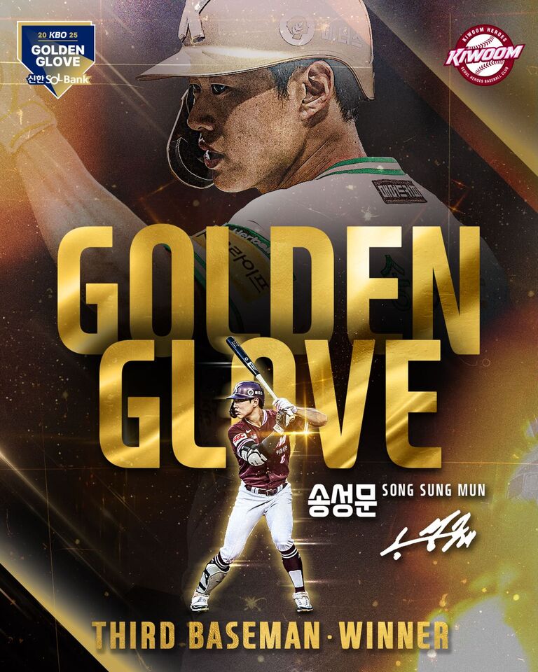 韓職年度金手套頒獎典禮 9 日在首爾蠶室登場,Kiwoom 英雄隊主戰三壘手宋成文(송성문)首次踏上金手套舞台,就抱回生涯10年的第一座金手套獎(類似中職最佳十人獎),更在致詞中透露即將升格當爸,激動表示:「這個獎讓我覺得自己像個能讓孩子驕傲的爸爸。」