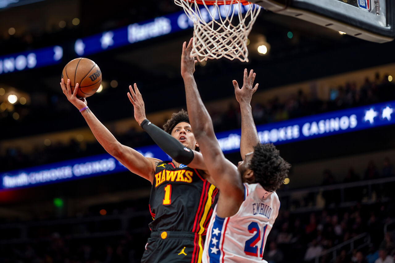 費城七六人15日作客挑戰亞特蘭大老鷹,明星搖擺人喬治(Paul George)打出本季代表作,全場狂轟本季個人新高表現出色,但地主老鷹靠著本季展現一哥本色的全能前鋒強森(Jalen Johnson)以12分、10籃板、12助攻,連4戰個人締造「大三元」數據的優異表現,率隊以120比117贏球。強森也成為自魔術強森(Magic Johmnson)之後,NBA首位不滿24歲,能連4戰完成大三元數據好手。