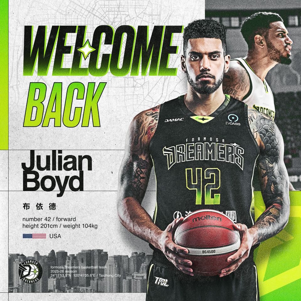 福爾摩沙夢想家今 (16) 日正式宣布,曾於2021–22與2023–24賽季效力球隊的布依德(Julian Boyd)再度披上夢想家戰袍,這也是他第三度回歸夢想家,重返熟悉的舞台,為團隊在攻防兩端注入即戰力。