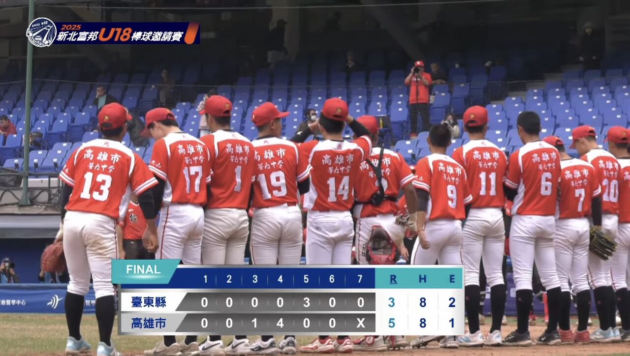 新北富邦U18棒球邀請賽19日上演焦點對決,高雄市與臺東縣在8強賽正面交鋒,雙方先發投手形成精彩投手戰;高雄市把握中段大局建立領先優勢,即便臺東縣後段急起直追,高雄市仍穩住陣腳,終場以5比3擊退臺東縣,順利挺進4強。