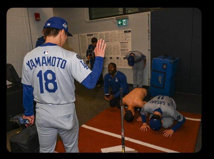 據日媒《中日體育》報導,該張照片以「Bow Down(鞠躬)」為題,於10月26日上傳至Instagram,拍攝於10月26日的世界大賽第2戰。當時山本由伸投出完投勝,佐佐木朗希與翻譯艾亞頓等人對他做出下跪致敬的動作。照片曝光後,日美球迷除了正面留言,也出現認為是惡作劇的不同聲音。