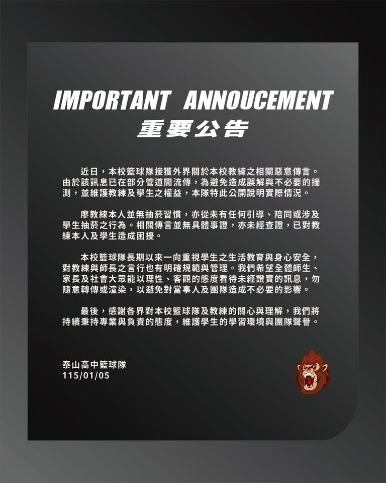 泰山高中籃球隊表示,近日學校籃球隊接獲外界關於本校教練之相關惡意傳言,由於該訊息已在部分管道間流傳,為避免造成誤解與不必要的揣測,並維護教練及學生之權益,特此公開說明實際情況。