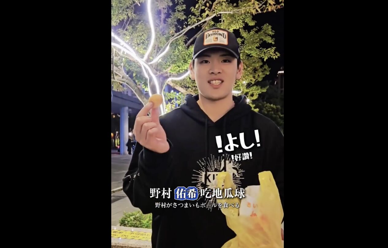 日本火腿球星野村祐希上個月為宣傳今年2月的台灣交流賽來台,記者會上點名最想吃的台灣夜市小吃就是「地瓜球」。火腿官方社群6日釋出他逛夜市的影片,一路玩遊戲、品嚐美食,最後壓軸如願吃到心心念念的地瓜球,整部影片都搭配「祐希」與日文「よし(Yoshi、讚啦)」同音的趣味哏。