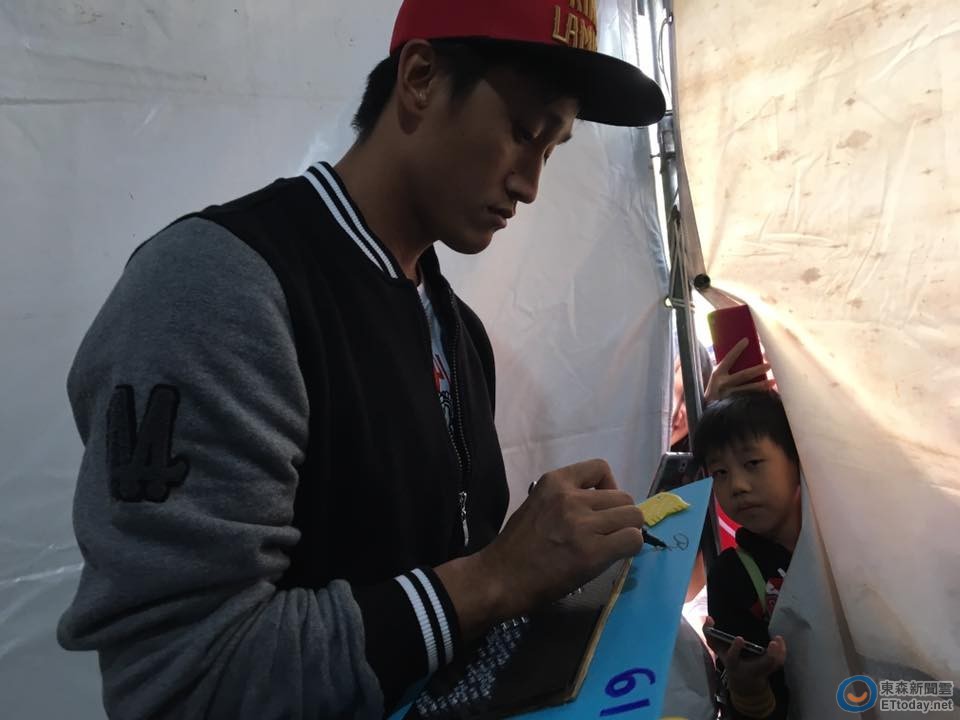 球員在舞台後方帳篷休息時,許多球迷駐足等候,還有一名球迷弟弟探頭探腦,剛好看到林智平、余德龍,瞪著水汪汪的眼睛,索取簽名與拍照。