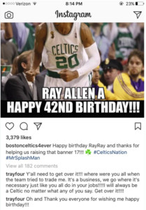 「前三分球王」艾倫(Ray Allen)在7月20日迎來他42歲的生日,一位塞爾提克球迷在Instagram發文慶祝,仍然有部分球迷對於艾倫當年轉隊到熱火的作法不諒解,紛紛在底下流...
