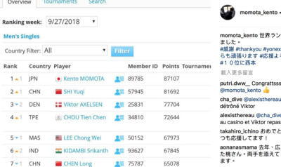 日本一哥桃田賢斗在連奪日本公開賽金牌以及中國公開賽銀牌,27日排名連升至第一,終於坐上球王寶座,他也在IG發文,「成為世界第一了。」並感寫所有人,而他所屬NT東日...
