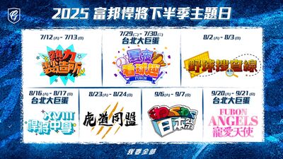 富邦悍將公布下半季7檔主題日,備受矚目的「XVIII悍將中學」及「寵愛天使」主題日將移師臺北大巨蛋盛大舉辦。07/29(二)-07/30(三)也將於大巨蛋推出平日主題日「夏...