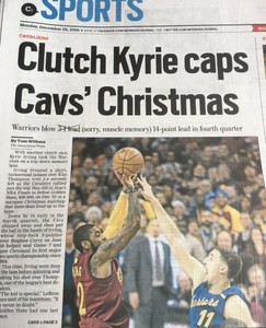 美國時間25日的聖誕大戰中,勇士再次遭到騎士逆轉,這也引爆了美國媒體,隔天早上的俄亥俄報就登出了這個消息,並且不放過嘲諷勇士的機會,寫下一行小小的標題「勇士在3...