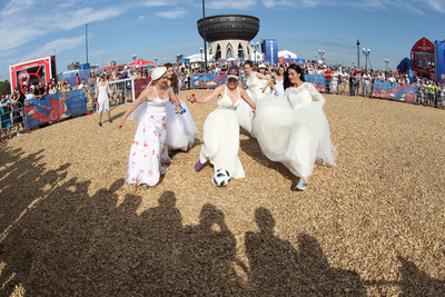 世足賽正在俄羅斯如火如荼開踢,競賽城市之一的喀山,還舉行一場另類的世足賽,上場踢球的,是一群穿著婚紗的女孩們,冠軍也能奪得大力神盃。