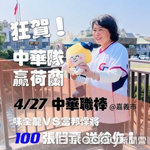 味全龍4月27日將在嘉義市立棒球場與富邦悍將對戰,嘉義市政府也將送出4月27日味全龍對戰富邦悍將的嘉義市開幕戰門票100張,即日起至3月31日止,民眾在「勇媽阿惠 - 黃敏...