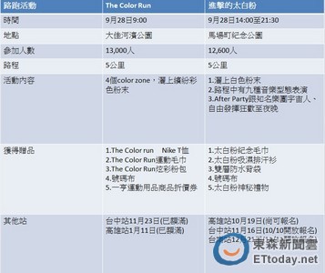 台灣近年來掀起路跑風潮,各種路跑活動應運而生,甚至開始擺脫比賽名次,主打創意Kuso,無論老幼都能參加,來自美國的「The Color Run」在台北開跑,吸引上萬人參加,28...