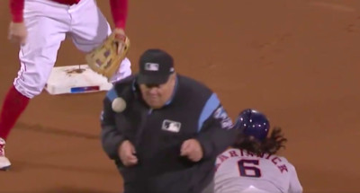 紅襪與太空人美聯冠軍戰G1,第8局出現一個讓球迷笑翻天的插曲。太空人發動盜壘,捕手嘗試阻殺傳偏,二壘審的65歲資深裁判威斯特(Joe West)卻一動也不動的挨了這一球,...