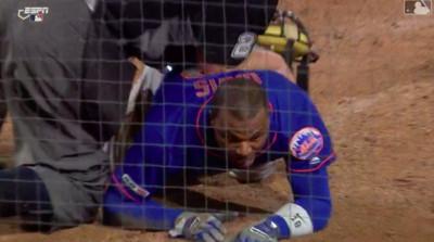 麥克尼歐(Jeff McNeil)擊出滾地球後,三壘的戴維斯(Rajai Davis)拔腿狂奔試圖搶下超前分,為了閃避回傳球意外撞倒主審威斯特(Joe West),等待身材龐大的威斯特緩...