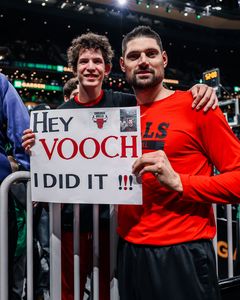 公牛昨日作客波士頓,弗塞維奇(Nikola Vucevic)和球迷斯捷潘(Stepan)的溫馨時刻感動眾人。這位球迷高舉「嘿,VOOCH,我做到了」的海報,實踐2021年4月時與偶像做的約定。