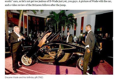 熱火球星「閃電俠」韋德(Dwyane Wade)因為腳傷還無法上場比賽,不過在18日過了30歲生日的韋德,卻在當天收到一台邁凱倫(McLaren)超跑當賀禮,讓閃電俠速度再升級。