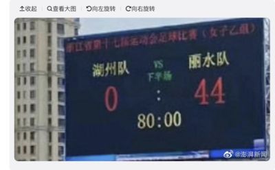 中國浙江第十七屆省運會足球女子乙組比賽第二輪賽事,日前卻出現了麗水隊44比0大勝湖州隊的誇張比數,引發外界譁然,質疑是不是造假的比賽?不過這場誇張比賽,經過調查...