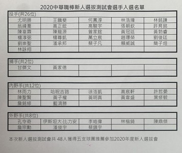 中職新人球員測試7月6日上午新莊棒球場舉行,測試會28日截止,合計83明選手審核通過,包括45名投手、4名捕手、20名內野手以及14位外野手。除了嘉義高中劉崇聖之外,高苑...