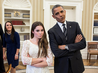 美國總統歐巴馬15日於白宮接見倫敦奧運體操代表隊時,模仿女子體操選手馬羅尼(McKayla Maroney)錯失金牌的歪嘴臭臉樣,甚至和本尊合照做紀念。馬羅尼原本被看好,能在倫...