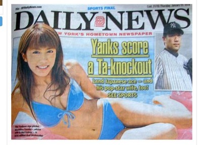 日投田中將大以7年1億5500萬美元(約新台幣47億)合約,加盟豪門紐約洋基,他的老婆里田舞卻意外躍上當地主流媒體版面,《紐約每日新聞》23日紙版,頭版上半部放的就是她...