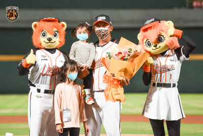 統一獅台南主場最終戰,邀請台南市三級棒球共25間學校蒞臨觀賽,賽前為王鏡銘舉辦百中繼慶祝儀式,神秘嘉賓姊姊王雅婷驚喜現身獻花,王鏡銘兩個孩子也親臨現場。