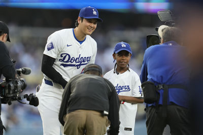 洛杉磯道奇今天是「大谷翔平搖頭娃娃日」,由大谷翔平邀請病童阿爾貝托(Albert)開球,他擔任開球捕手。本來球團是請大谷翔平的老婆田中真美子開球,但他和老婆商量後...