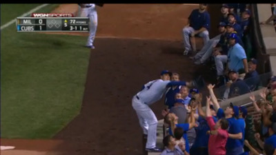 攀在全壘打牆上、翻過觀眾席的接殺每季都很精彩,但是今天有個更不可思議的,芝加哥小熊17日與密爾瓦基釀酒人進行雙重賽,晚間的比賽一壘手瑞佐(Anthony Rizzo)上演站...
