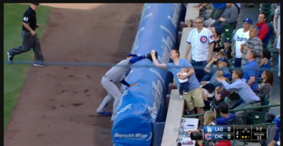 大聯盟許多球迷接界外球的技巧,美妙、精彩程度可能不下於場上的球員,道奇與小熊之戰,一名爸爸一手在餵奶,一手還可以接到飛球,堪稱一絕。