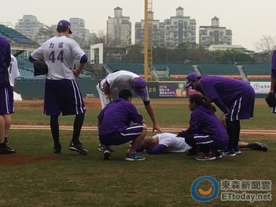犀牛30日在新莊球場續戰統一獅,終結者潘力在賽前練習突然被天外飛來一球擊中後腦勺,痛倒在地,總教練葉君璋透過記者轉述,才知道潘力後腦勺中彈,嚇得從椅子跳起來:...