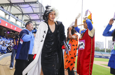 富邦悍將27日舉辦球迷會,菜鳥變裝秀壓值登場,各角色爭奇鬥豔,其中以蔡佳諺扮演的性感101忠狗「庫伊拉」呼聲最高,讓球迷驚呼連連。