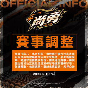 受到颱風影響,台南棒球場受損,統一獅預估9月前仍無法全面修復,意即今年例行賽接下來都無法回到台南主場。原訂於台南舉行的「胡金龍引退賽主題日」將改至9月20日於高...