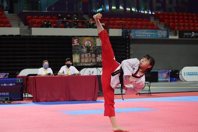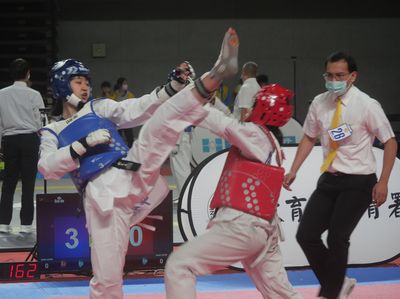 全國中等學校跆拳道錦標賽持續進行對打第二天賽程,國中男女賽程部分,大長腿選手仍較佔優勢,180公分的頭前國中呂理中、176公分的平鎮國中陳柔嘉分別在國男55公斤、國...