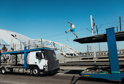 Red Bull極限跑酷玩家Alexander Titarenko刷新了前所未有的紀錄,以”Tunnel flip”的技巧從一輛移動的卡車跳到另一輛卡車。