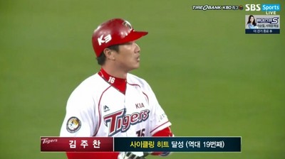 起亞虎外野手金周璨15日5打席分別敲出全壘打、中外野飛球、一壘安打、三壘安打、二壘安打,達成完全打擊,成為起亞虎隊史第1人。