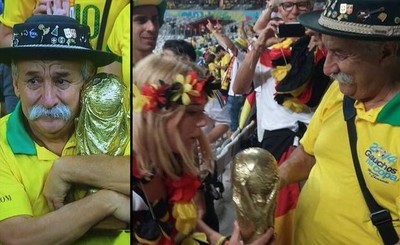 有洋蔥!巴西隊在世足四強賽以1比7慘敗給德國隊,讓巴西球迷難過到痛哭流涕,直呼無法接受。有媒體在米內羅球場看台上,拍到一名老先生抱著「世足冠軍獎盃模型」,臉上...